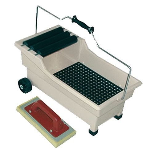 Vasca in plastica antiurto, su due ruote più due piedi. Tre rulli in plastica su perni in acciaio. Griglia e frattone in plastica.