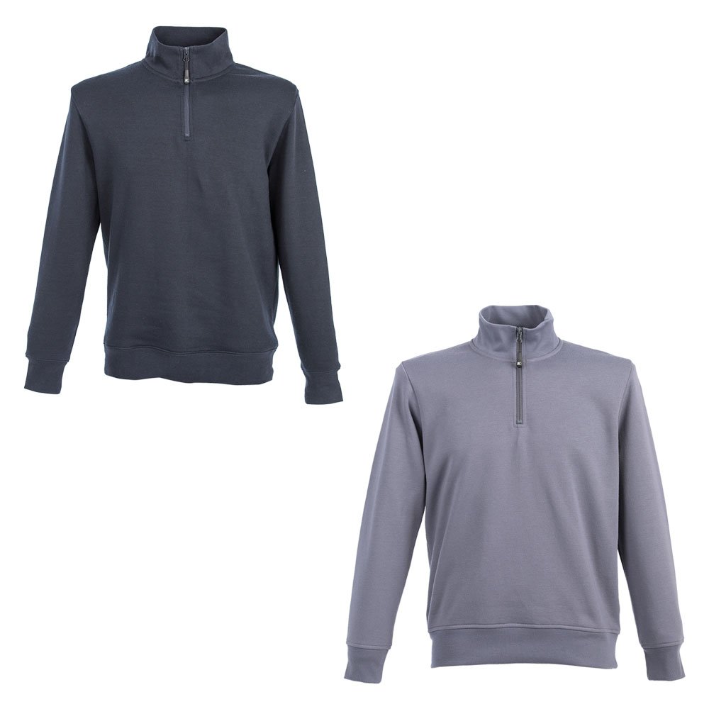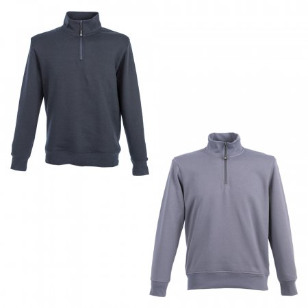 Chiusura centrale mezza zip. In 65% cotone, 35% poliestere. Collo a lupetto con nastro di rinforzo. Polsini, fondo maglia e collo in costina elasticizzata. Peso 280 gr/mq. DPI: I categoria.