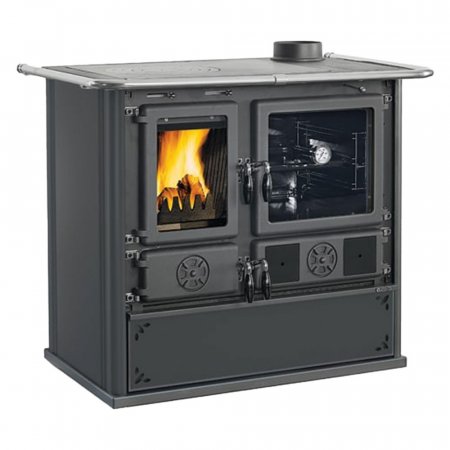 Rivestimento esterno in acciaio. Porte e facciata in ghisa smaltata. Porta fuoco con doppio vetro. Forno da 78 lt. Piastra e cerchi in ghisa levigata, focolare in materiale refrattario e ghisa. Cassettone portalegna. Scarico fumi Ø 150 superiore centrale/posteriore. Dimensioni mm.1074x669x861. Consumo orario 2,85 kg/ora. Metri cubi riscaldabili 315. Potenza termica nominale 11 kw.