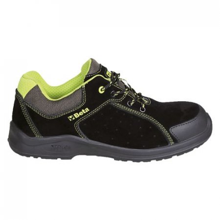 Tomaia in pelle scamosciata traforata idrorepellente, suola in poliuretano bidensità, puntale in materiale polimerico, resistenza '200 Joule'. Antiperforazione in fibra composita con trattamenti ceramici. Sottopiede anatomico con rialzo ammortizzante in zona tallone. Prodotto completamente metal free. Certificazione EN ISO 20345:2011. Grado di protezione 'S1P'.