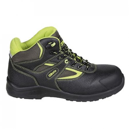 Prodotto 'metal free'. Pelle idrorepellente con inserti in nylon, suola in poliuretano bidensità. Puntale in materiale polimerico, resistenza 200 Joule. Antiperforazione in fibra composita con trattamenti ceramici, sottopiede anatomico in carbon. Sfilamento rapido. Grado di protezione 'S3'.