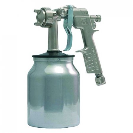 Aerografo per verniciatura con tazza inferiore in alluminio da 1000cc con chiusura a baoinetta. Coperchio in Nylon6. Tubo di pescaggio in nylon 10x8. Attacco alimentazione aria aereografo 11/A. Confezionato in scatola.