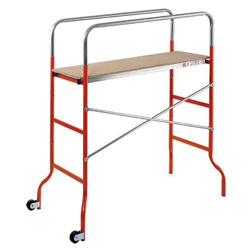 Struttura tubolare in acciaio verniciato, dotato di pianale di calpestio in legno multistrato e di due ruote. Completamente smontabile. Peso kg. 15,8. Portata Kg 120. Altezza massima di lavoro cm. 306. Dimensioni cm. 144 x 62 x H.142. Made in Italy.