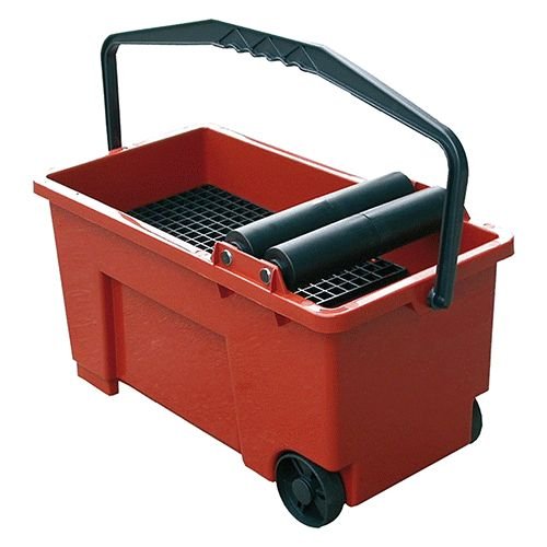 Vasca in plastica antiurto, su due ruote più due piedi. Due rulli in plastica su boccole antiusura e griglia in plastica.
